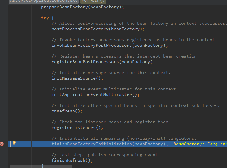 11) 调用ApplicationContext的refresh()方法,完成IoC容器可用的最后一道工序。