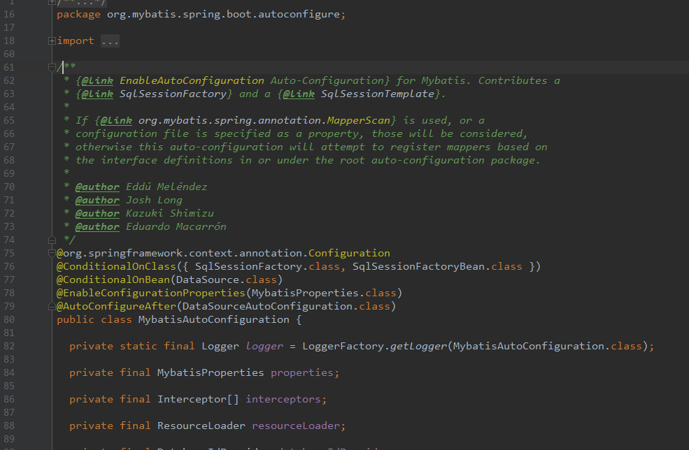进入org.mybatis.spring.boot.autoconfigure.MybatisAutoConfiguration中,主要看一下类头: